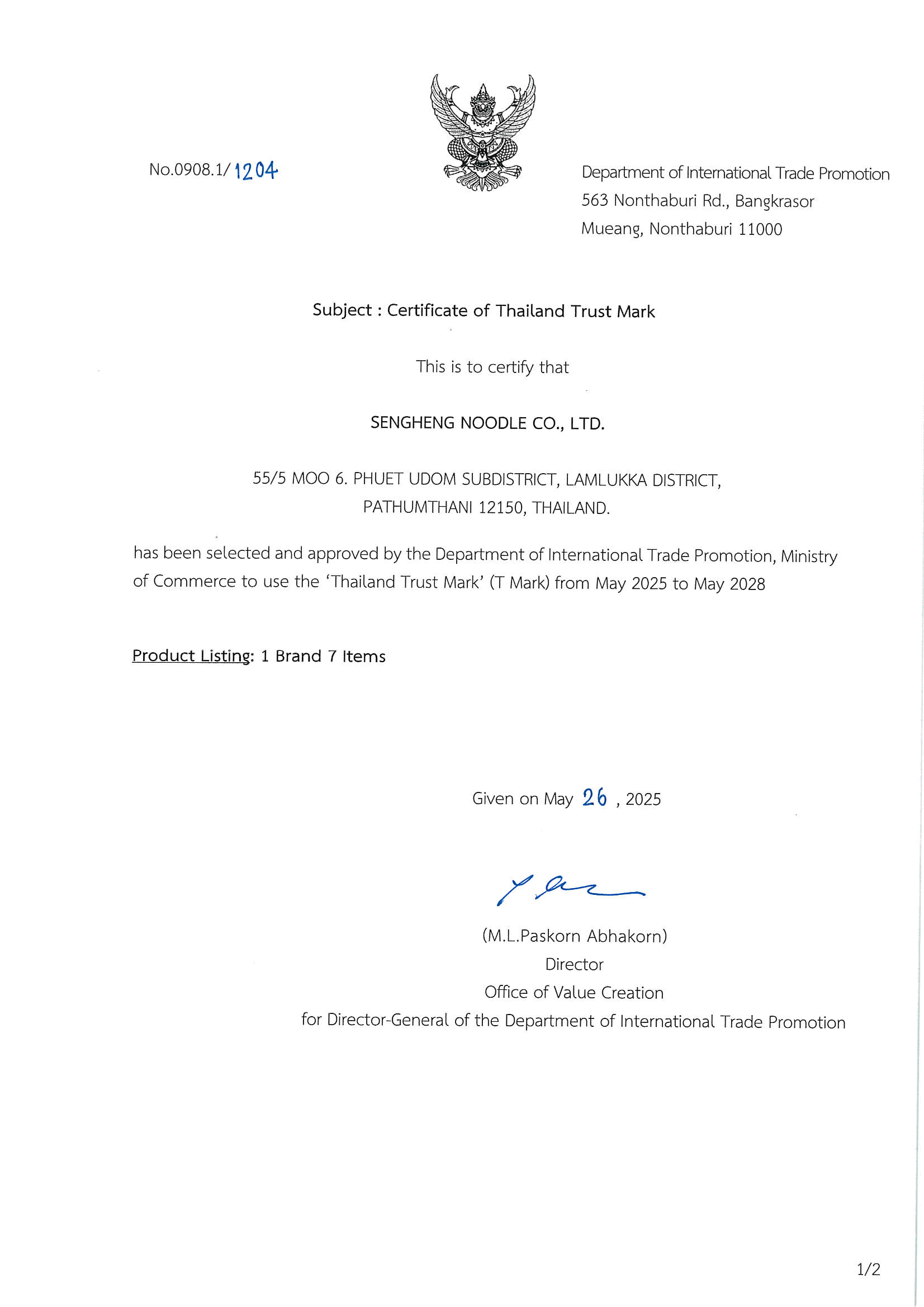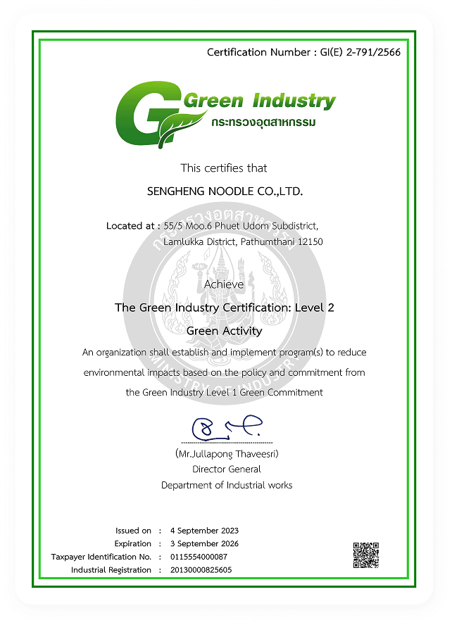 Sengheng Noodle T MARK Certificate