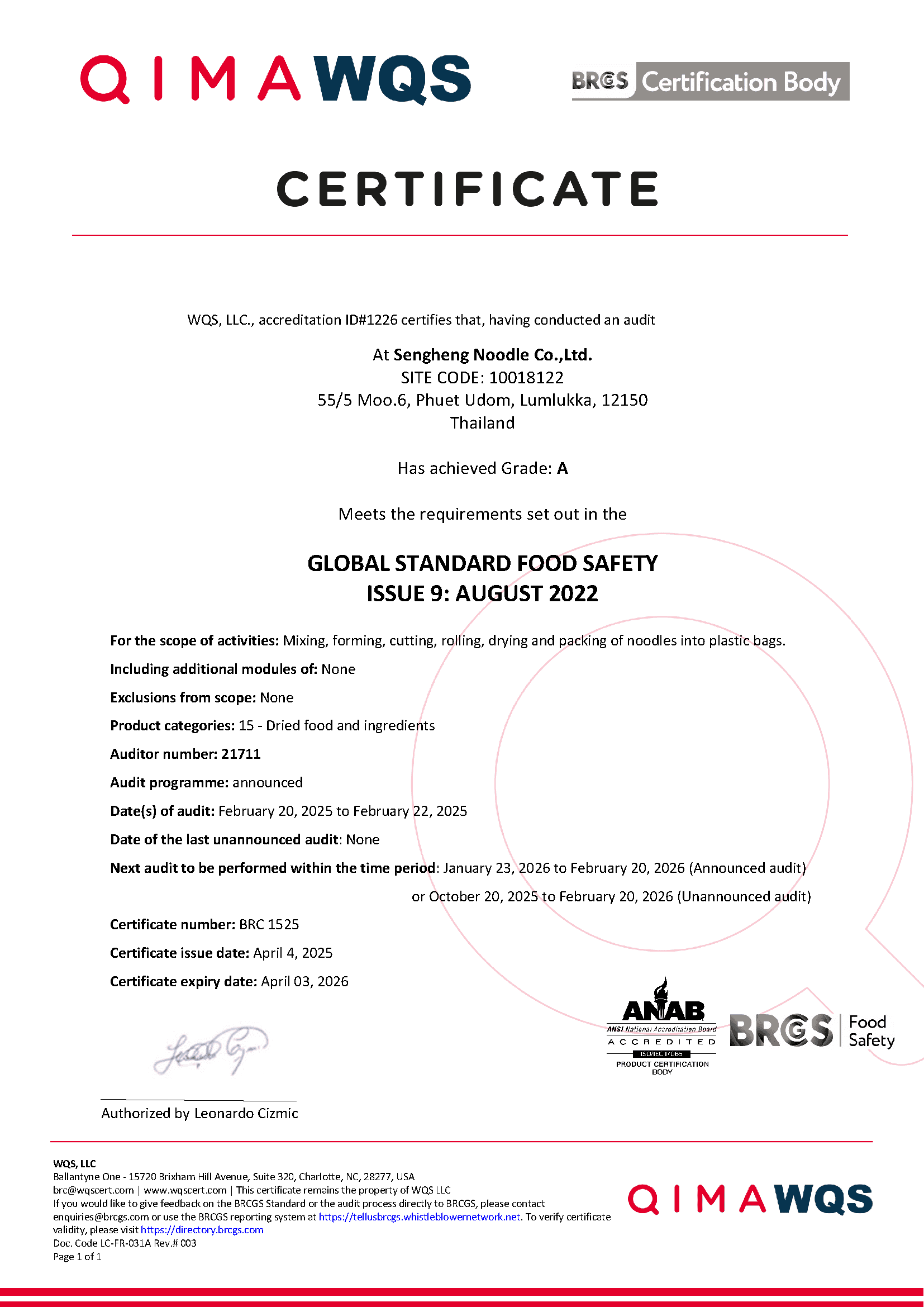 Sengheng Noodle BRCGS Certificate