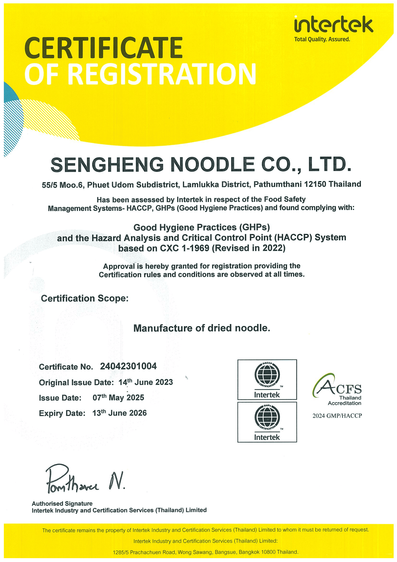 Sengheng Noodle GHPs & HACCP Certificate