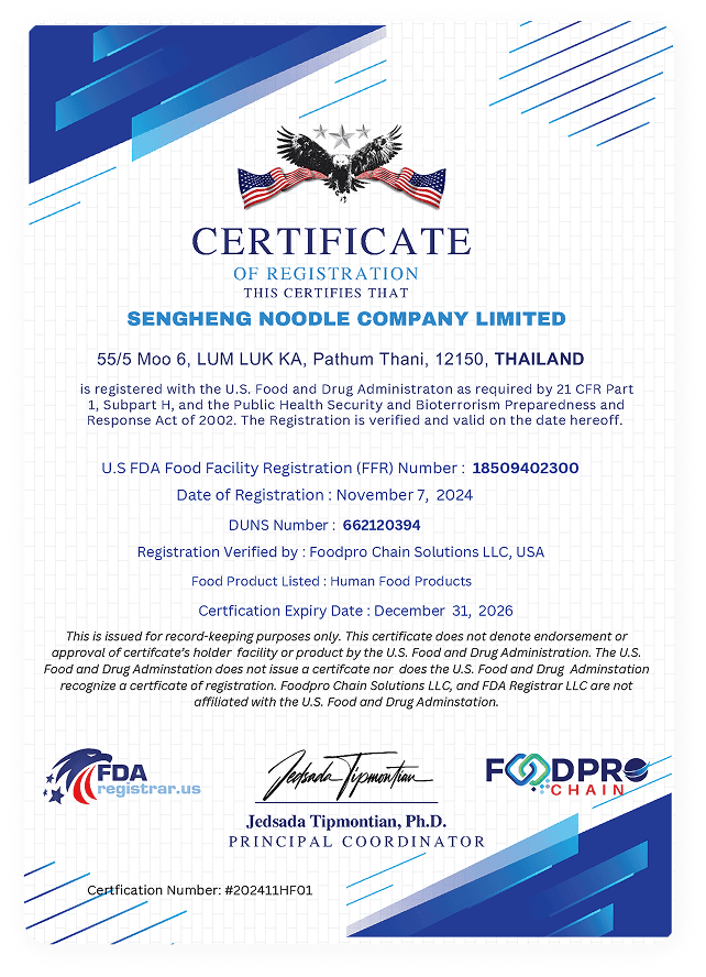 Sengheng Noodle US FDA Certificate